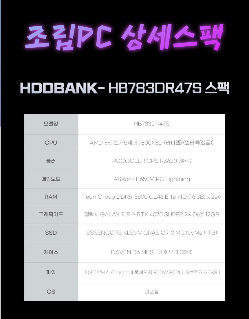 [하드뱅크] 고사양 게이밍용PC [7800X3D/32GB/1TB/RTX4070S]